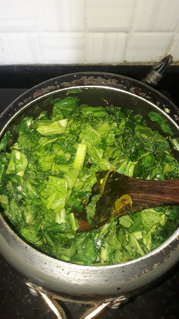 Step 1: Get some spinach. It’s already diced up (if not, wash them first and dice them into small pieces). I’m using Rai Ko Saag (idk the english name for this lol).